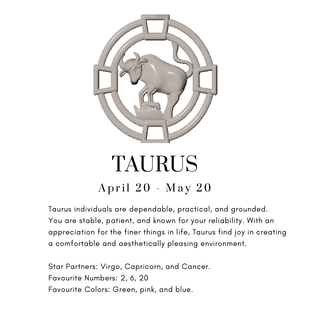 Personality: Taurus individuals are dependable, practical, and grounded. You are stable, patient, and known for your reliability. With an appreciation for the finer things in life, Taurus find joy in creating a comfortable and aesthetically pleasing environment.