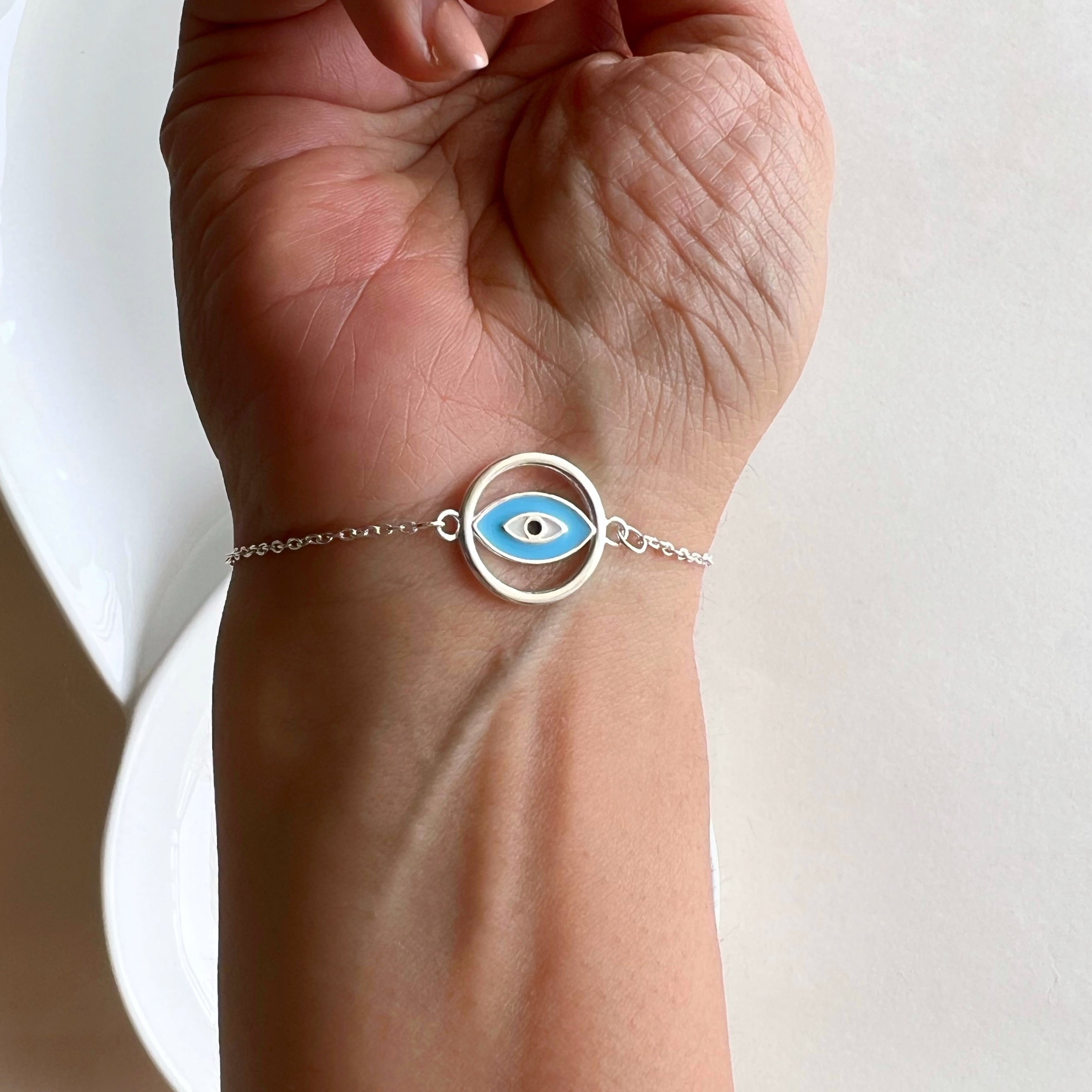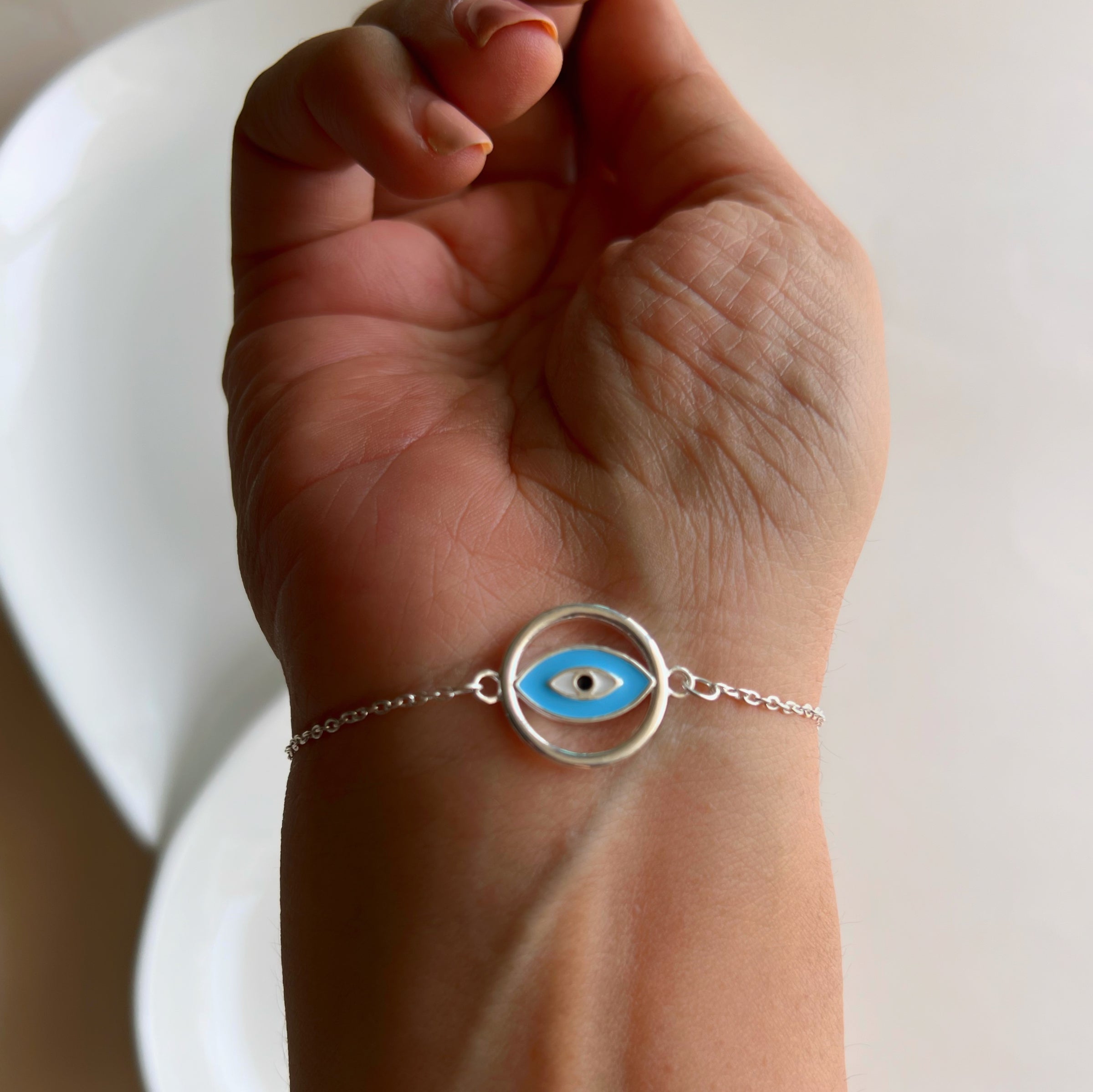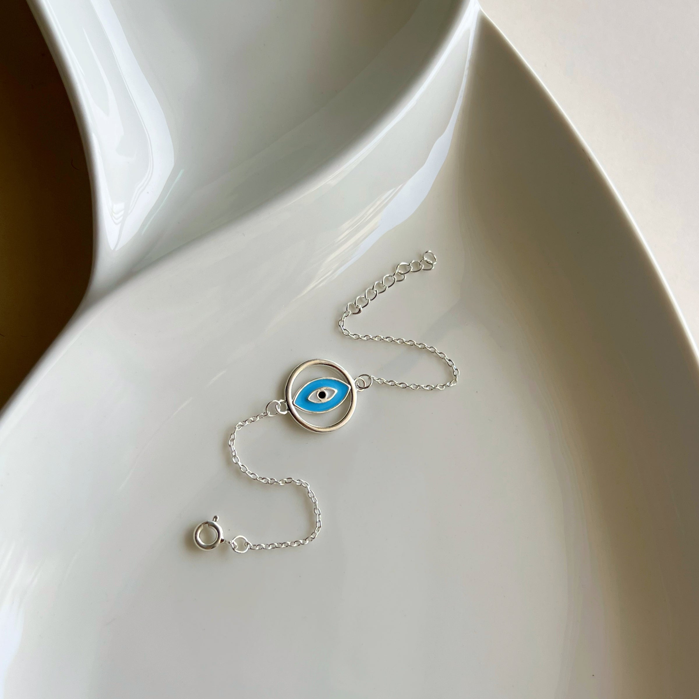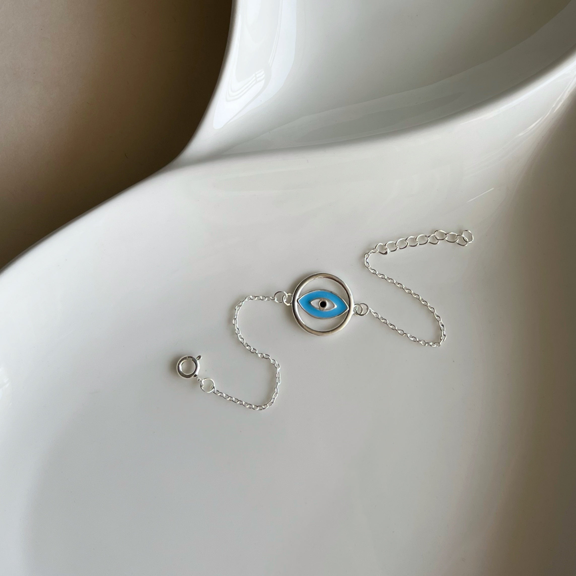 This stunning bracelet is your everyday nazar shield. Handcrafted in 92.5 silver with glossy enamel, it features a floating evil eye framed in a clean, round orbit. Minimal, meaningful, and made to guard your energy—while looking effortlessly good on the wrist.