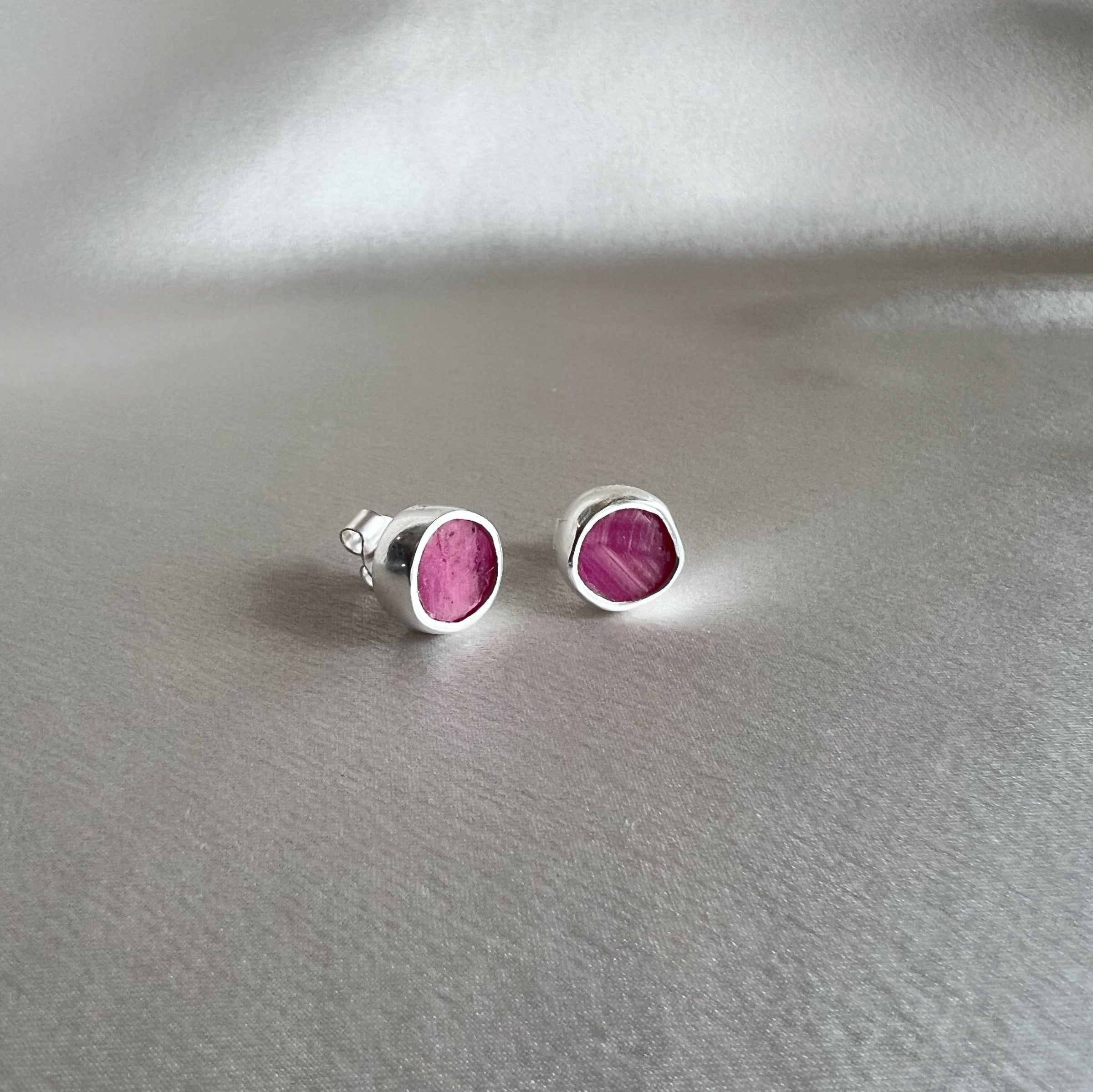 Crafted in pure 92.5 certified silver, these studs feature real Ruby gemstones — each one naturally unique, just like you. No two pieces are alike, making your pair beautifully mismatched in the most magical way. With their deep red tones and raw, fiery charm, these studs add a bold spark to your everyday style.